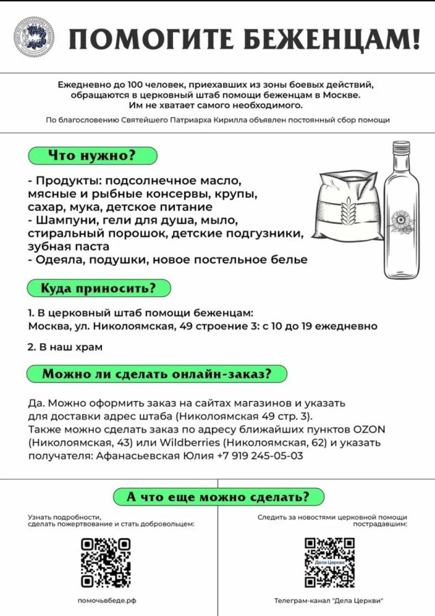 Также сбор вещей проводится онлайн (см. листовку) и в Москве (г. Москва, ул. Николоямская 49, строение 3).