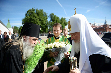 У святых врат обители Святейшего Патриарха встречали: председатель Учебного комитета Русской Православной Церкви, ректор Московской духовной академии архиепископ Верейский Евгений; председатель Синодального отдела по монастырям и монашеству, наместник Троице-Сергиевой лавры архиепископ Сергиево-Посадский Феогност; глава Сергиево-Посадского муниципального района Московской области М.Ю. Токарев; духовенство и насельники Лавры.
