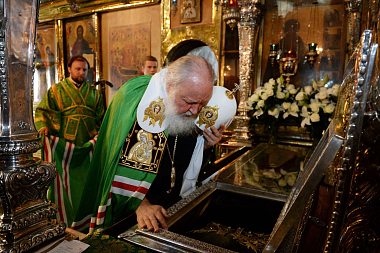 По прибытии в Лавру Предстоятель Русской Православной Церкви в сопровождении иерархов и духовенства проследовал в Троицкий собор, где поклонился честным мощам преподобного Сергия Радонежского.