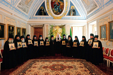 С приветственным словом к Предстоятелю обратился архиепископ Сергиево-Посадский Феогност. В дар Его Святейшеству наместник Лавры преподнес икону Святой Троицы, созданную в иконописных мастерских обители.