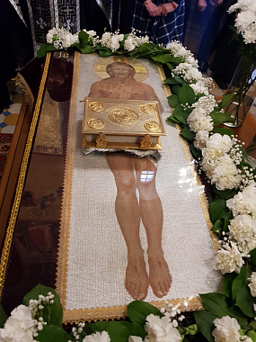 В завершение утрени был совершен чин погребения Святой Плащаницы, которую обнесли крестным ходом вокруг собора.