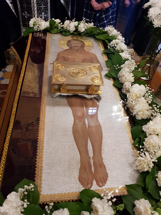 Днем состоялось уставное богослужение – вечерня с выносом Святой Плащаницы и чтение канона о распятии Господа и на плач Пресвятой Богородицы.