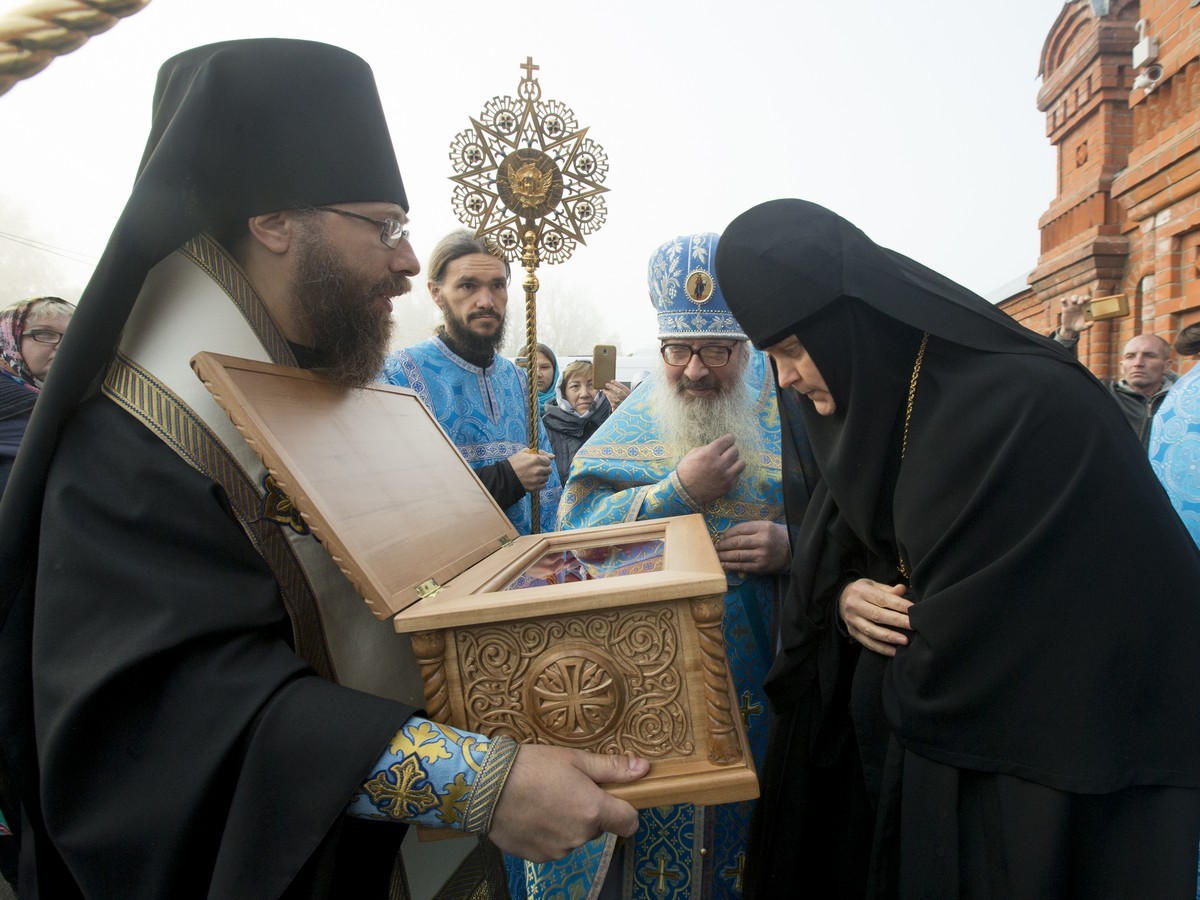 Преосвященный Леонид поздравил матушку игумению и насельниц с принесением большой частицы мощей преподобного Амвросия, покровителя монастыря.