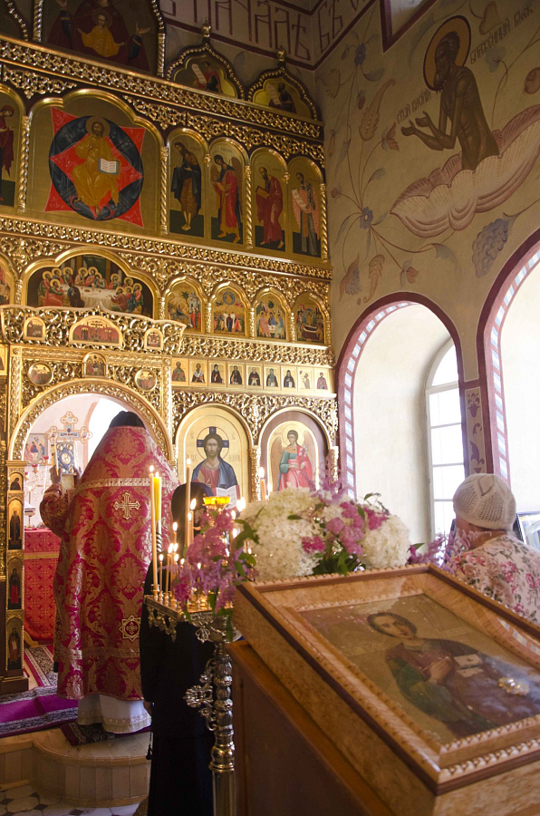 Накануне, 8 августа, в обители был отслужен молебен с водосвятием и акафистом вмч. Пантелеимону, затем началось праздничное всенощное бдение.