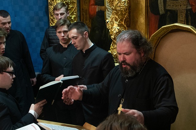 Песнопения за вечерним богослужением исполнили братский хор Троице-Сергиевой лавры под управлением архимандрита Глеба (Кожевникова) и второй академический хор под управлением иеромонаха Нестора (Волкова).