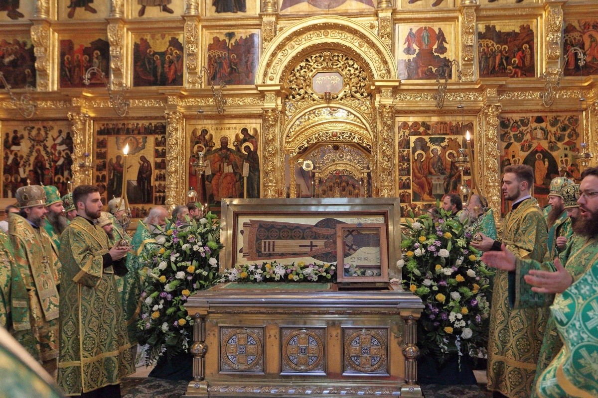 Для поклонения верующих празднично благоукрашенная рака с мощами святителя Иннокентия была установлена в центре Успенского собора.