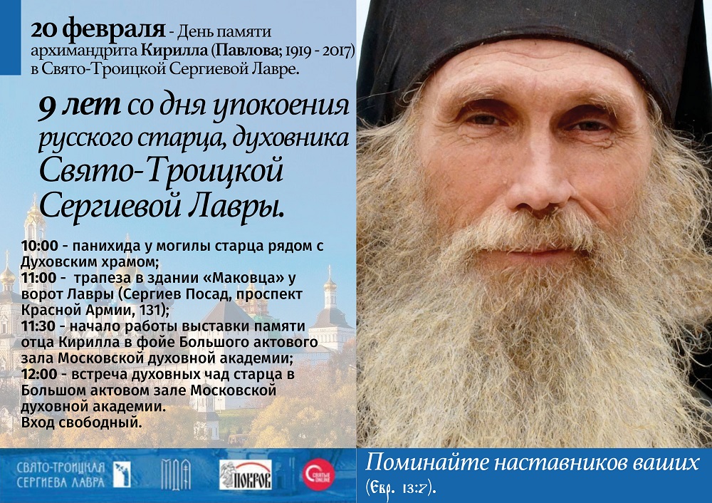20 февраля 2026 года в Свято-Троицкой Сергиевой лавре состоится день памяти архимандрита Кирилла (Павлова), фронтовика, многолетнего духовника Лавры, почившего 20 февраля 2017 года.