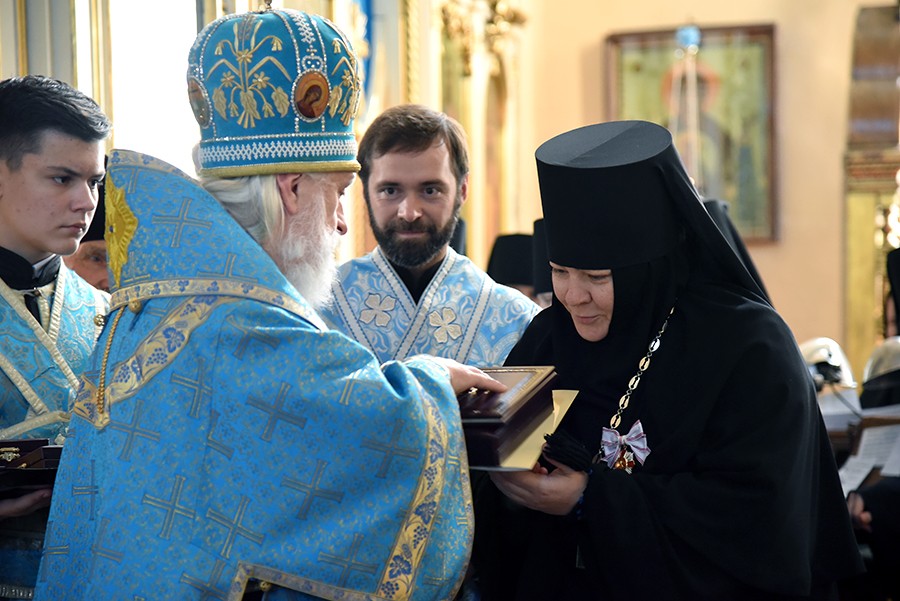 По окончании богослужения архиепископ Верейский Евгений огласил поздравление Патриарха Московского и всея Руси Кирилла по случаю престольного праздника обители и вручил настоятельнице обители игумении Филарете (Калачевой), духовенству и благодетелям монастыря церковные награды.
