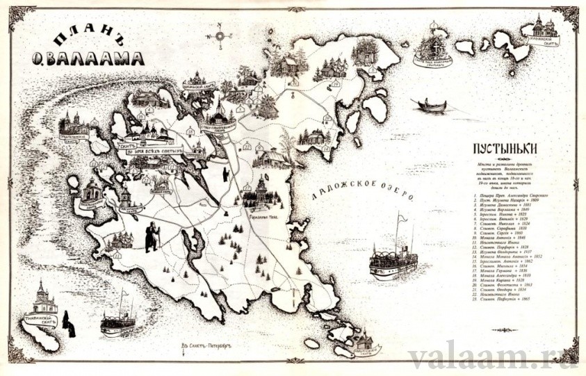 В иные времена на Валааме насчитывалось 23 пустыньки. Летом 1920 года монахами Иоанном и Гавриилом были произведены изыскания местонахождения и перепись пустынек валаамских подвижников, ими же была тогда составлена карта острова с указанием найденных пустынек и пещер подвижников. Уже в те годы в относительной сохранности были найдены только три пустыньки и одна пещера на Святом острове, остальные представляли собой груду развалин из гнилых бревен, кирпичей и оснований фундаментов; иногда только колодец или небольшой пруд служили указанием на то, что некогда здесь была пустынька.