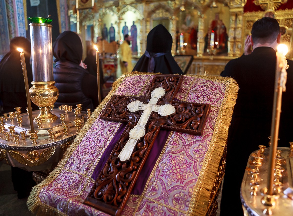 Накануне, на утрене, после великого славословия, состоялся вынос Креста и поклонение ему по чину Крестопоклонной недели.