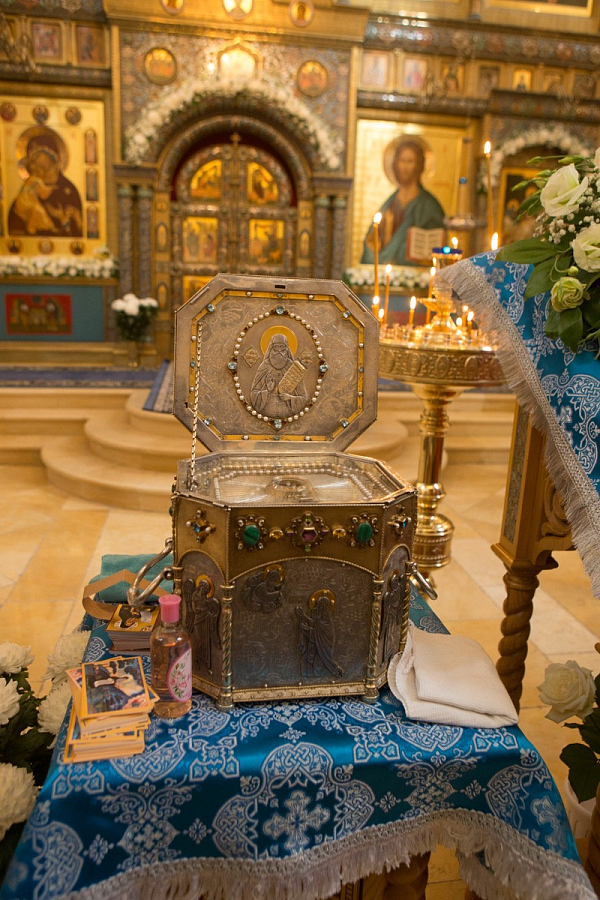 У Святых врат обители святые мощи торжественно встретили заместитель председателя Синодального отдела по монастырям и монашеству, настоятельница Зачатьевского ставропигиального женского монастыря игумения Иулиания (Каледа) с сестрами; настоятельница Свято-Елисаветинского женского монастыря Русской Православной Церкви Заграницей г. Мюнхена (Германия) игумения Мария (Сидоропулу); настоятельница монастыря Св. прпмц. Параскевы (о. Корфу, Греция) игумения Фотиния (Маршалл).