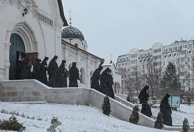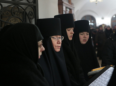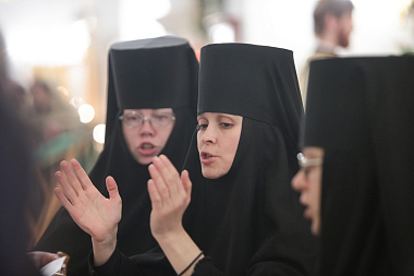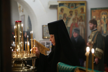 За богослужением молились Заместитель Председателя Синодального отдела по монастырям и монашеству, настоятельница Зачатьевского монастыря игумения Иулиания (Каледа) с сестрами, прихожане, гости и паломники обители.