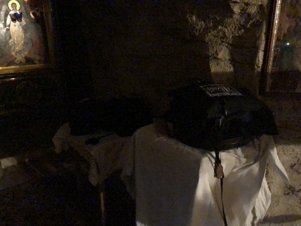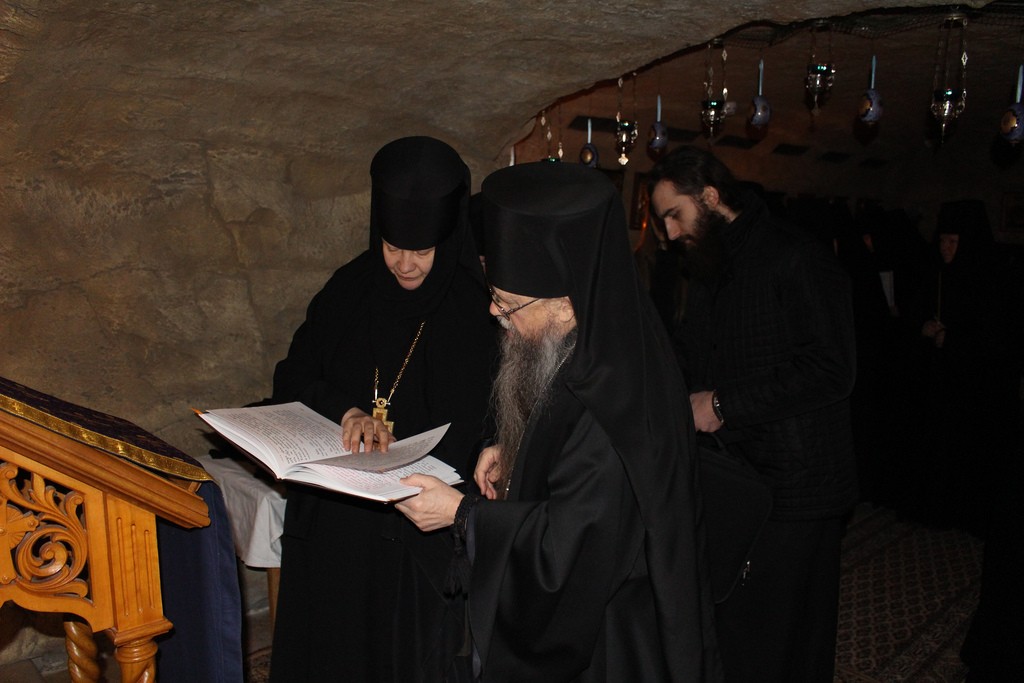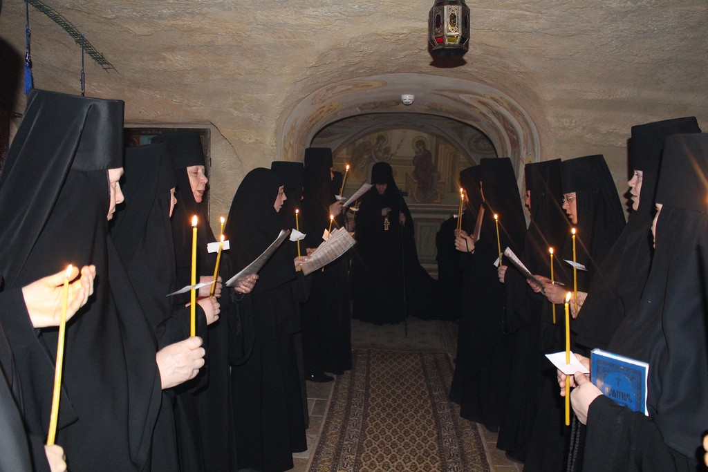 Чин пострижения совершался в подземном приделе Успения Пресвятой Богородицы храма Сошествия Святого Духа на апостолов. В темном пространстве небольшого храма, похожего на пещеру, при мягком свете лампад у образов и свечей в руках сестер звучали умилительные песнопения и молитвы благодарения Богу, избавившему Своих избранниц от мирского плена и приведшего их на путь спасения. В присутствии сестер, духовной матери игумении и священнослужителя архимандрита приносились Богу обеты монашеского жительства в целомудрии, нестяжании, послушании. Не только постригаемые, но и все сестры внутренне просили Господа об обновлении и благодатном укреплении душевных сил для достойного прохождения иночества и монашеского пути.