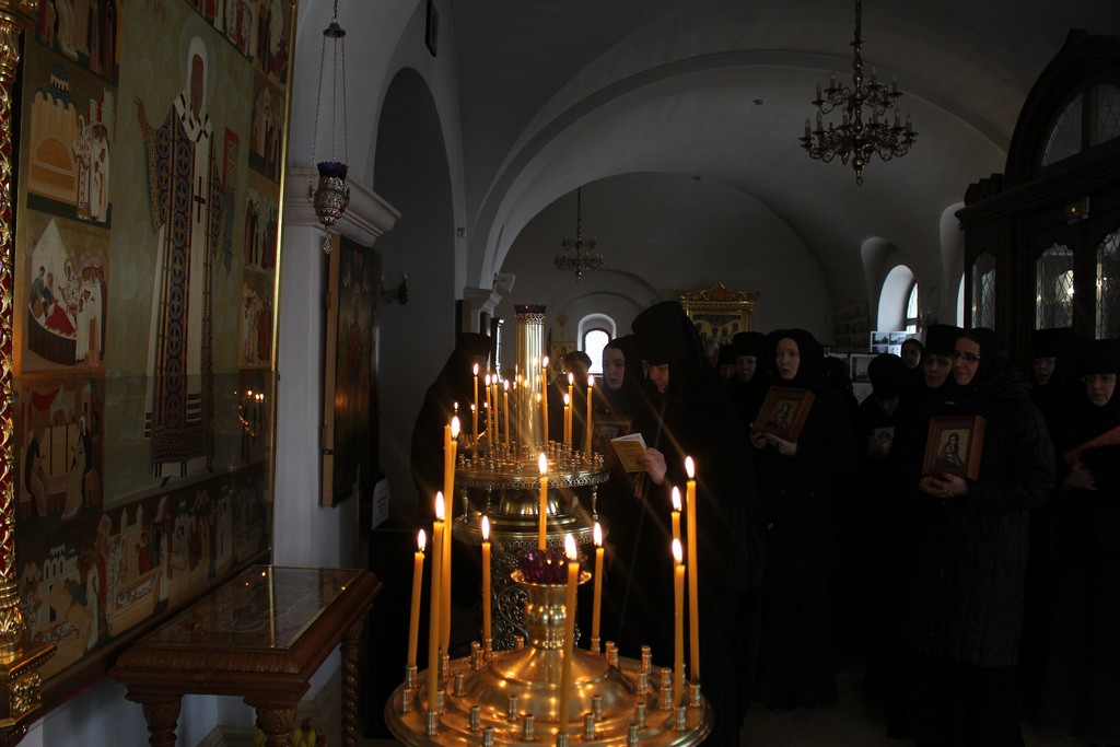 В соборном храме перед чтимым образом Пресвятой Богородицы «Милостивая» пропели молитву, постригаемые испросили у всех прощения, далее поклонились образу святителя Алексия с чтением молитвы. У гробницы прпп. Иулиании и Евпраксии матушка игумения прочла молитву святым основательницам обители. Испросив благословения у Божией Матери и святых покровителей обители, насельницы вышли из собора и проследовали к месту пострига, где в благоговейном молчании стали ожидать назначенного времени.