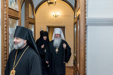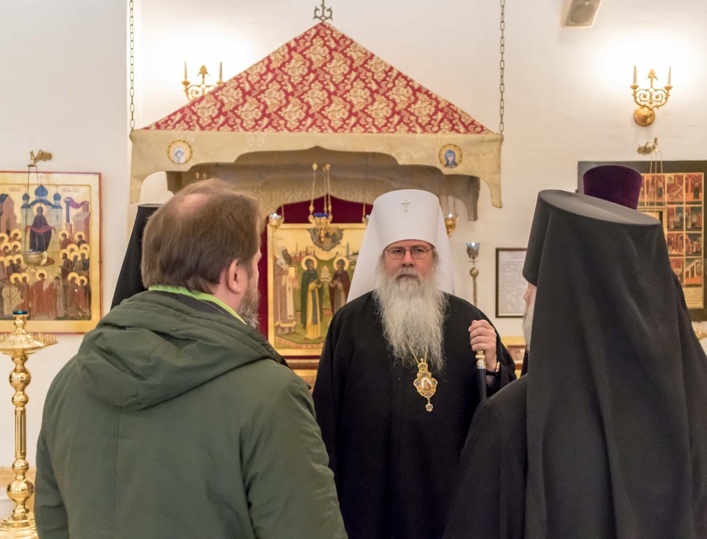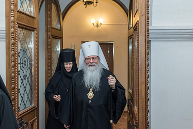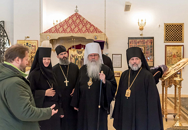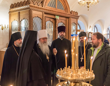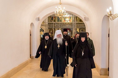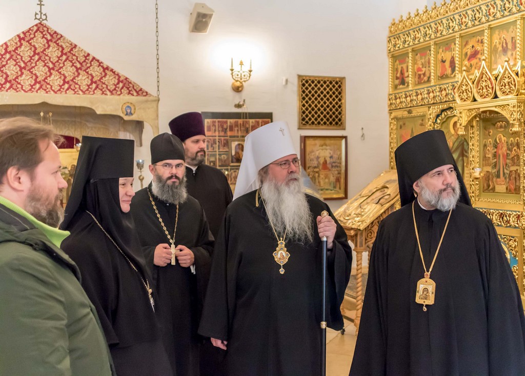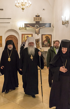 Его Блаженство осмотрел мемориальную доску на наружной стене дома с изображением святителя Тихона, затем гости прошли в кабинет на третьем этаже, где, предположительно, могла находиться палата святителя Тихона, и пропели тропарь и величание святому Патриарху, полюбовались прекрасным видом на монастырь, которым утешался и святитель Тихон, по воспоминаниям его современников. Для Блаженнейшего митрополита Тихона особенно дорого всё, что связано с его Небесным покровителем.