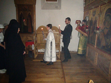 По сложившейся традиции богослужение длилось около шести часов с 22.00 до 04.00 часа утра. Службу возглавил доцент и заведующий библиотекой Московской духовной академии игумен Дионисий (Шленов).