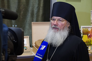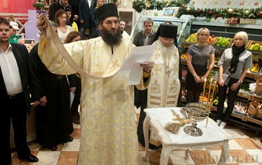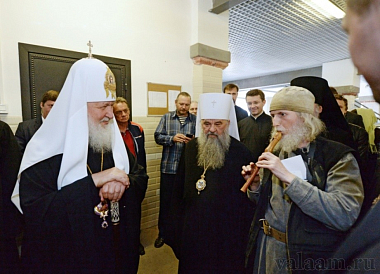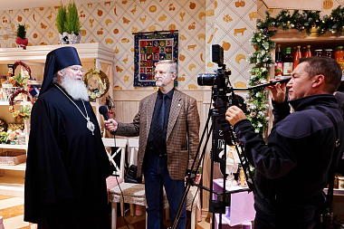 Открытие прилавка для валаамских сыров, представленных в фермерском магазине, приехал освятить игумен Спасо-Преображенского Валаамского монастыря епископ Троицкий Панкратий: