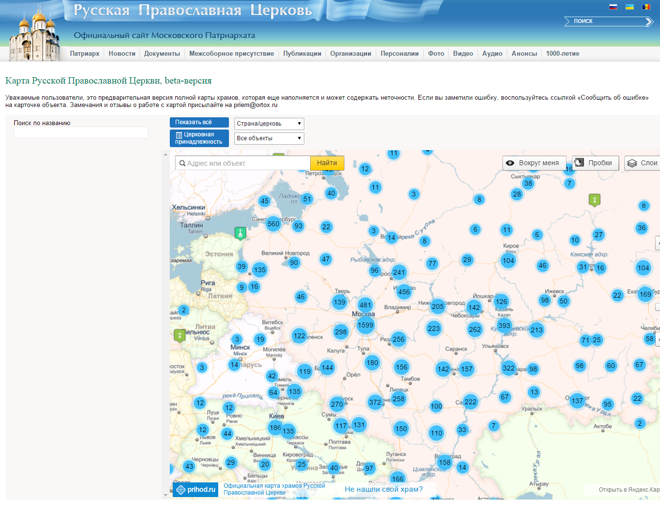 Епархии, храмы и монастыри Русской Православной Церкви приняли участие в самом масштабном интернет-проекте Церкви «Единая карта храмов и монастырей», бета-версия которого недавно стала доступна для пользователей сети на официальном сайте Московского Патриархата.