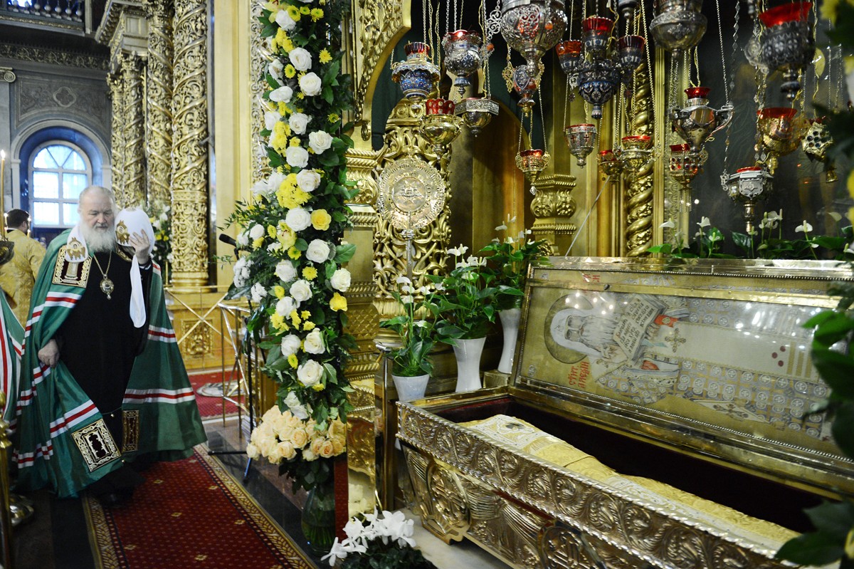 Патриарх Кирилл напомнил пастве, что святитель Алексий взошел на всероссийскую кафедру «в самое тяжелое время, когда начали разрываться связи между северной и южной частями Руси, когда многие внешние силы были направлены на то, чтобы никогда более не было единой и Святой Руси».