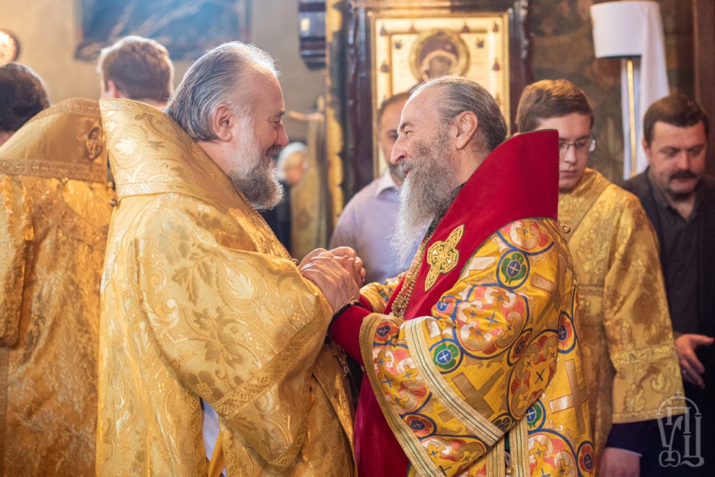 Его Блаженству сослужили: председатель Церковного суда Украинской Православной Церкви митрополит Каменец-Подольский и Городокский Феодор, наместник Киево-Печерской обители митрополит Вышгородский и Чернобыльский Павел, управляющий делами Украинской Православной Церкви митрополит Бориспольский и Броварской Антоний, митрополит Днепропетровский и Павлоградский Ириней, митрополит Тульчинский и Брацлавский Ионафан, митрополит Тернопольский и Кременецкий Сергий, митрополит Черкасский и Каневский Софроний, митрополит Николаевский и Очаковский Питирим, митрополит Белоцерковский и Богуславский Августин, митрополит Черниговский и Новгород-Северский Амвросий, митрополит Харьковский и Богодуховский Онуфрий, митрополит Почаевский Владимир, митрополит Черновицкий и Буковинский Мелетий, митрополит Уманский и Звенигородский Пантелеимон, архиепископ Бучанский Пантелеимон, архиепископ Яготинский Серафим, архиепископ Роменский и Бурынский Иосиф, архиепископ Боярский Феодосий, архиепископ Нежинский и Прилукский Климент, архиепископ Бердянский и Приморский Ефрем, архиепископ Бородянский Варсонофий, архиепископ Фастовский Дамиан, епископ Вознесенский и Первомайский Алексий, епископ Шепетовский и Славутский Евсевий, епископ Хотинский Вениамин, епископ Гостомельский Тихон, епископ Барышевский Виктор, епископ Белогородский Сильвестр, епископ Ладыжинский Сергий, епископ Макаровский Гедеон, гости обители в священном сане, духовенство монастыря.