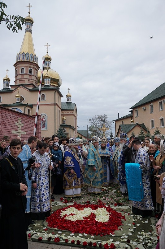Перед Божественной литургией Предстоятель Украинской Православной Церкви совершил чин освящения новых монастырских храмов: церкви в честь Великомученика Георгия, а также храма в честь Преподобных отцов Оптинских и святителя Тихона, Патриарха Московского и всея Руси.
