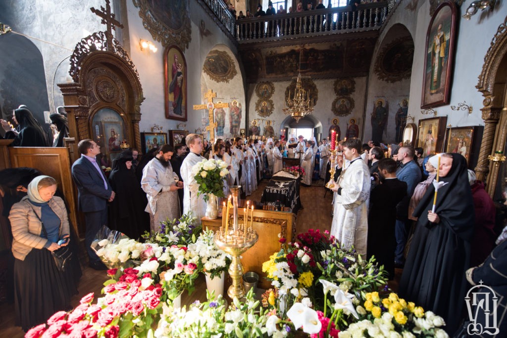 Перед чином отпевания по благословению Предстоятеля Украинской Православной Церкви управляющий делами Украинской Православной Церкви митрополит Бориспольский и Броварской Антоний совершил Божественную литургию в главном храме Флоровского монастыря в сослужении архиепископа Нежинского и Прилукского Климента, епископа Золотоношского Иоанна, духовенства украинской столицы.