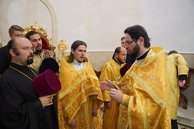 Его Блаженству сослужили митрополит Одесский и Измаильский Агафангел, митрополит Бориспольский и Броварской Антоний, митрополит Криворожский и Никопольский Ефрем, митрополит Елисаветградский и Новомиргородский Иоасаф, архиепископ Уманский и Звенигородский Пантелеимон, архиепископ Северодонецкий и Старобельский Никодим, епископ Фастовский Дамиан, епископ Южненский Диодор, наместник обители архимандрит Мануил (Заднепряный), духовенство монастыря и гости в священном сане.