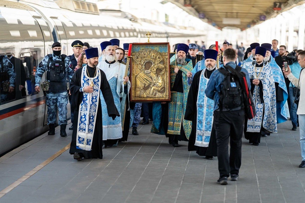 Священнослужители вынесли икону из вагона поезда и при пении тропаря Пасхи «Христос Воскресе», «Богородице, Дево, радуйся», «Царица моя преблагая» пронесли по перрону. В зале официальных делегаций Ленинградского вокзала епископ Мстислав в сослужении духовенства совершил краткий молебен.