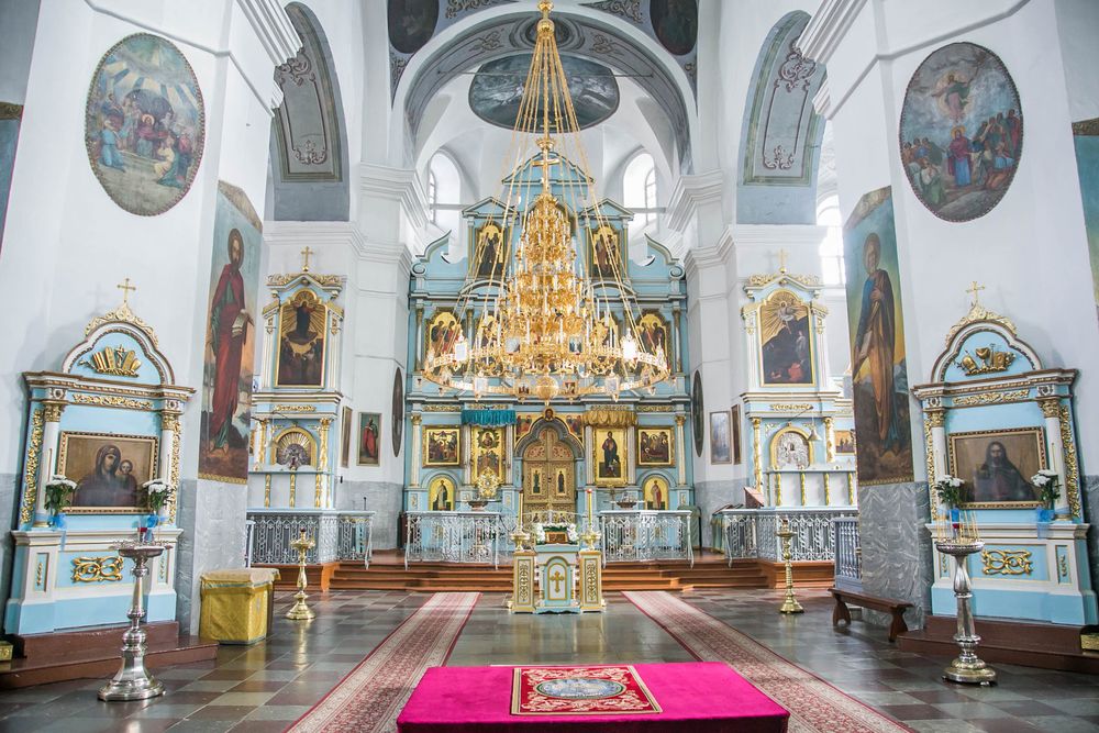 Храм строился в эпоху расцвета белорусского храмового зодчества, стиля барокко. Несмотря на перестройки и изменения внешнего облика, внутри Успенский собор сохранил свое барочное архитектурное убранство. Первоначально храм имел только центральный иконостас, который сохранился до нашего времени. В 1779 году для росписи этого иконостаса, а также иконостаса Явленской церкви был приглашен мастер Григорий Медведский. Иконостас собора был выполнен в характерной барочной манере. Боковые иконостасы по времени относятся к ремонту храма в 60-х годах XIX столетия, равно как и серебряные ризы на образах. На стенах храма сохранились росписи разного времени. Росписи на столбах и стенах, выполнены в послевоенное время, изображают наиболее чтимых святых, в том числе белорусских, а также большие церковные праздники.