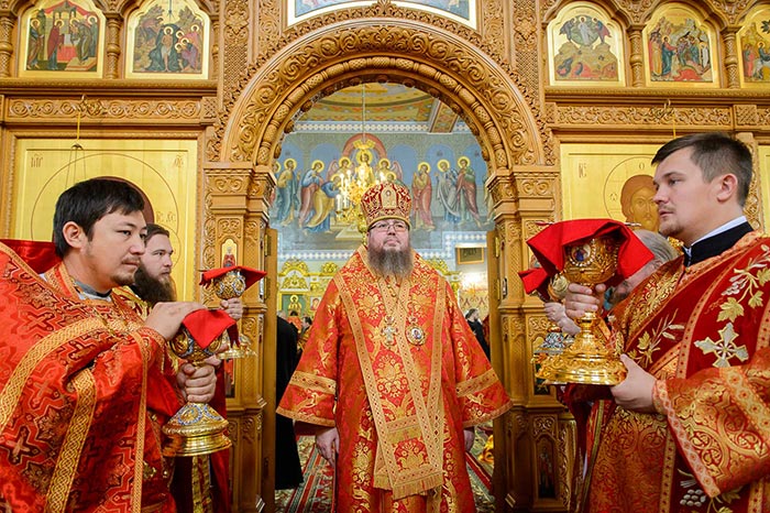 За богослужением молились: митрополит Днепропетровский и Павлоградский Ириней, митрополит Тверской и Кашинский Виктор, митрополит Криворожский и Никопольский Ефрем, архиепископ Уральский и Актюбинский Антоний, архиепископ Чимкентский и Таразский Елевферий, епископ Костанайский и Рудненский Анатолий, епископ Талдыкорганский Нектарий, епископ Каскеленский Геннадий, епископ Павлодарский и Экибастузский Варнава, епископ Карагандинский и Шахтинский Севастиан, епископ Усть-Каменогорский и Семипалатинский Амфилохий, епископ Кокшетауский и Акмолинский Серапион, епископ Петропавловский и Булаевский Владимир.