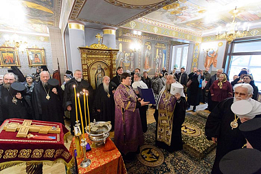 На аналое в центре собора рядом с Животворящим Крестом Христовым был установлен ковчег с мощами мучениц Веры, Надежды, Любови и Софии.