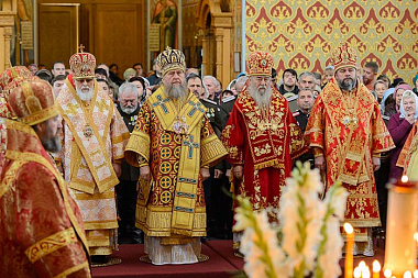Церковные песнопения исполняли хор Митрополичьего округа под управлением заслуженного деятеля искусств России О.Н. Овчинникова и хор Софийского собора под управлением О.Г. Шульженко.