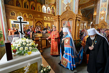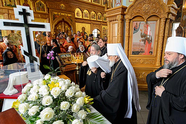 Богослужение завершилось поклонением Честному и Животворящему Кресту и славлением святым мученицам Вере, Надежде, Любови и матери их Софии.