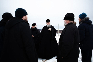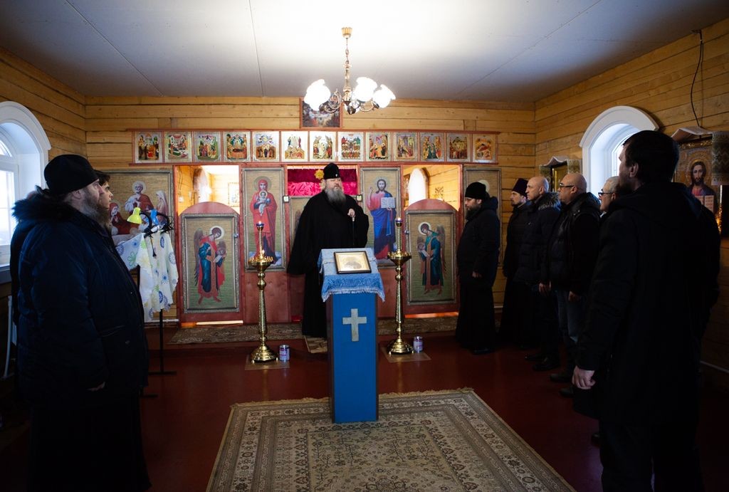 Владыку сопровождали глава Епархиального отдела по монастырям и монашеству игумен Варлаам (Дульский), наместник Свято-Троицкого Антониево-Сийского мужского монастыря игумен Феодосий (Нестеров), благочинный Холмогорского округа протоиерей Олег Шевчук, местный священник Александр Аншуков, а также глава муниципального образования «Кехотское» Надежда Уткина.