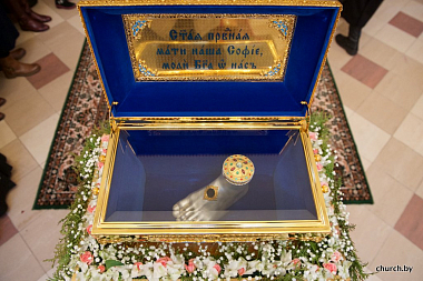 Затем было совершено славление перед ковчегом с частицей мощей святого мученика младенца Гавриила Белостокского и стопой праведной княгини Софии Слуцкой.