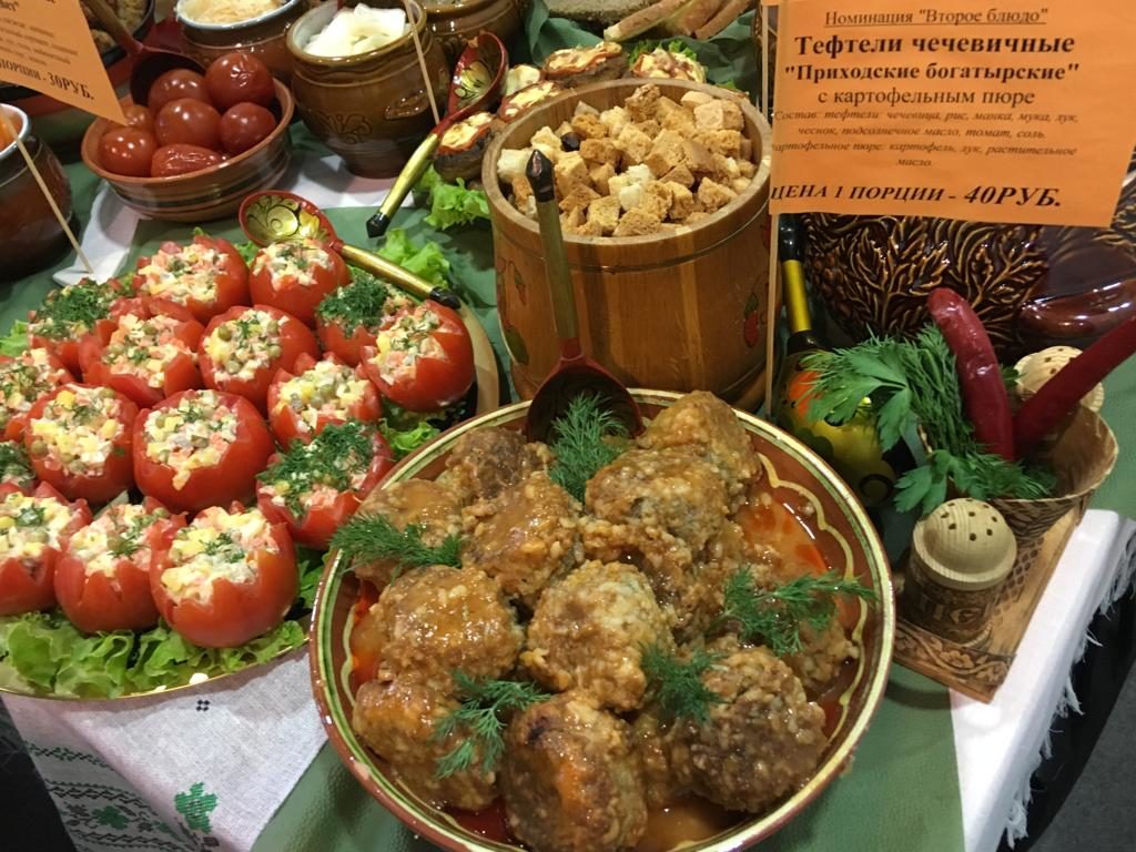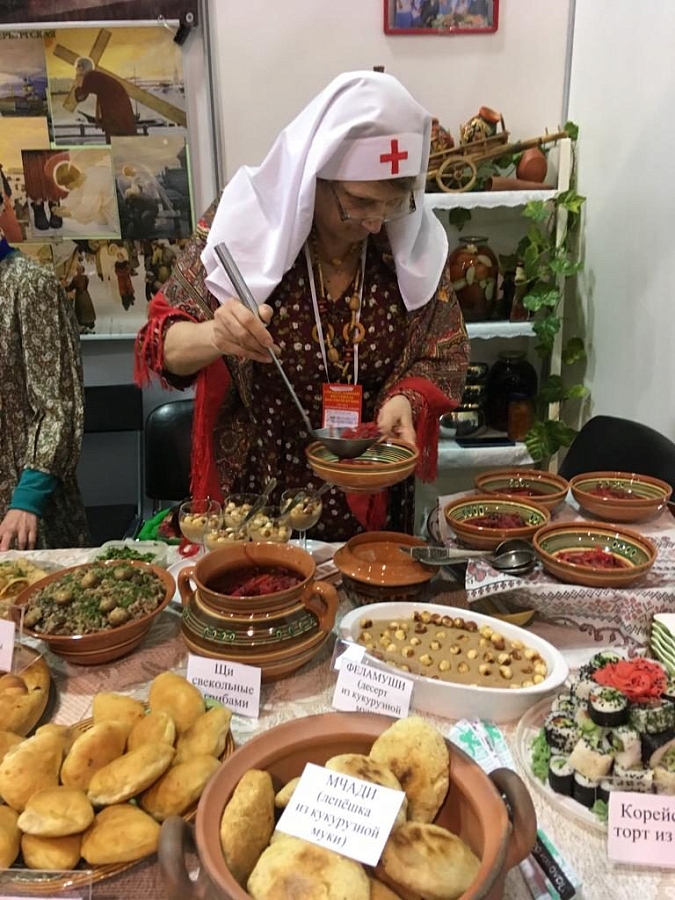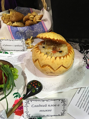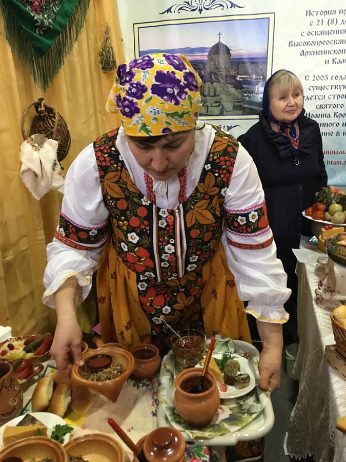 На стендах – горячие блюда, салаты, закуски, выпечка в ассортименте, который никак не ассоциируется с постной едой; ореховые котлеты, тыквенный десерт, чечевичные тефтели, паштеты, фаршированные овощи и фрукты, пироги и расписные пряники, булочки, блинчики, постное печенье и пирожные, сладкий плов, морсы и кисели.