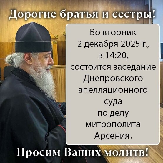 Во вторник, 2 декабря 2025 года, должно состояться заседание Днепровского апелляционного суда (г. Кривой Рог, просп. Мира, 24) по делу наместника Свято-Успенской Святогорской лавры митрополита Святогорского Арсения.