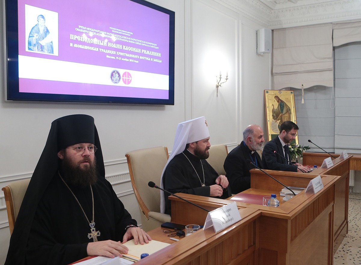 В докладе, посвященному преподобному Иоанну Кассиану Римлянину и его учению о Евхаристии, Его Высокопреосвященство, подробно описав жизненный путь духовного писателя, особо отметил, что на христианском Западе и Востоке Кассиан стал широко известен как духовный наставник благодаря двум сочинениям: «О правилах общежительных монастырей» и «Собеседования». В них он обобщил опыт восточно-христианского подвижничества и представил своего рода свод авторитетных аскетических правил, касающихся организации внешней и внутренней жизни монахов. «В своем учении о Евхаристии преподобный Иоанн Кассиан предстает, прежде всего, как организатор монашеской жизни. Все разбираемые им аспекты евхаристического богословия связаны с конкретными практическими вопросами: как часто монахам следует причащаться; с какими искушениями они могут столкнуться при подготовке к принятию Евхаристии, как духовнику решить вопрос о достойном и недостойном причащении инока», – сказал в своем выступление митрополит Иларион.
