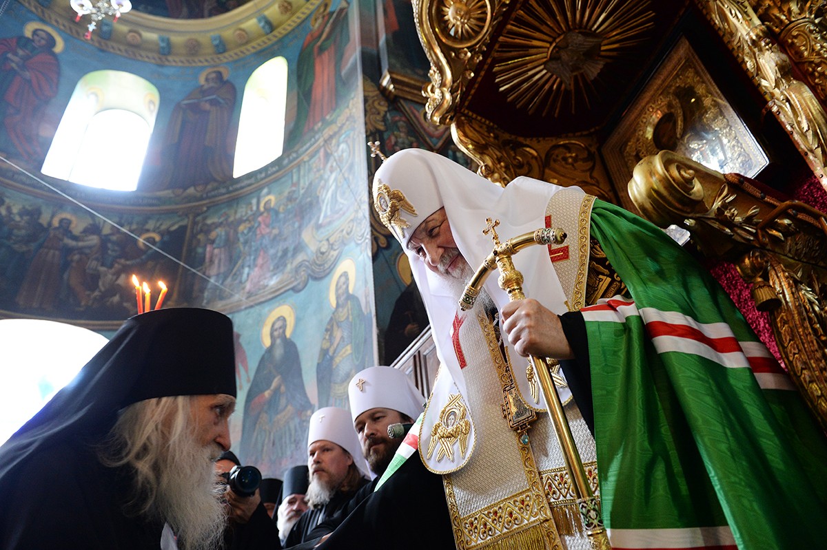 27 мая 2016 года Святейший Патриарх Московский и всея Руси Кирилл молился за малой вечерней в соборе Пантелеимонова монастыря на Святой Горе Афон.