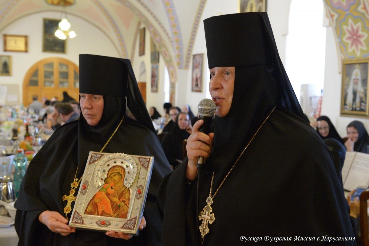 По окончании богослужения митрополиты Тамбовский Феодосий, Капитолиадский Исихий, начальник Русской Духовной миссии архимандрит Александр, клирики Миссии и духовенство из числа паломников торжественно приветствовали Блаженнейшего Патриарха Иерусалимского и всей Палестины Феофила III, прибывшего в Горненский монастырь, чтобы разделить с матушкой игуменией, паломниками и всем освященным собором радость праздника.