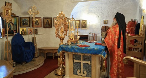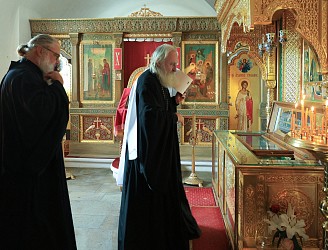 Перед началом богослужения митрополит Феогност поклонился честным мощам преподобного Аристоклия, старца Афонского и Московского.
