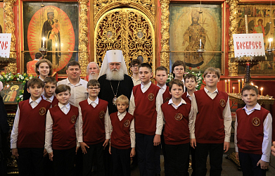 Богослужебные песнопения исполнил объединенный хор (взрослый и детский) Патриаршего подворья храмов в Зарядье.