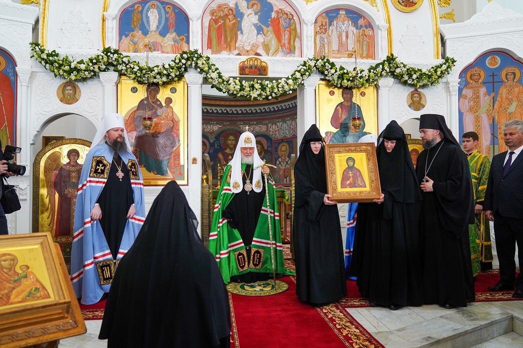Настоятельница монастыря игумения Евдокия (Левшук) также приветствовала Предстоятеля Русской Церкви и преподнесла в дар Его Святейшеству икону преподобной Евфросинии Полоцкой, написанную сестрами обители.
