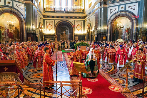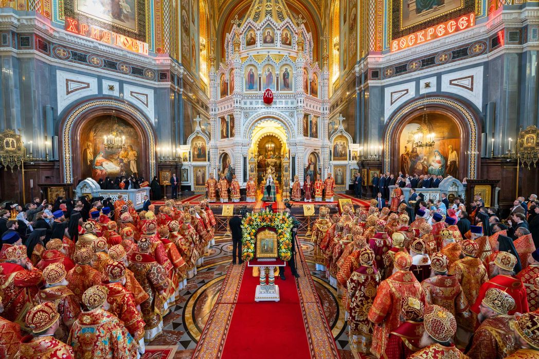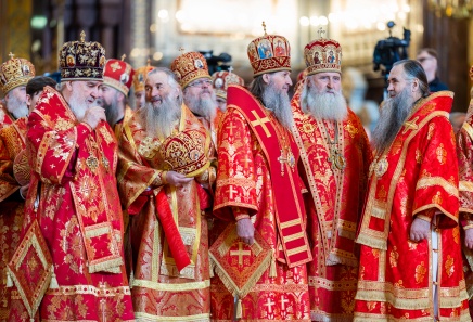 «Дорогие владыки, отцы, братья и сестры, еще раз поздравляю всех вас с этим замечательным днем. Думаю, на каждого из нас оказывает особое влияние соборное богослужение. Когда архиереи вместе совершают Божественную службу, они действительно являют образ Соборной Апостольской Церкви. Дай Бог, чтобы никакие человеческие усилия, направленные на ослабление нашего братства, на разрушение соборности нашей Церкви, никогда не возымели успеха. Дай Бог, чтобы через это соборное служение и через это соборное деяние укреплялись вера и духовная жизнь в нашем народе. И дай Бог, чтобы в ответ на наши скромные усилия действительно процветала Русь Святая — в вере православной, благочестии и чистоте. Аминь. Христос Воскресе!» — сказал Святейший Владыка, напутствуя участников богослужения.