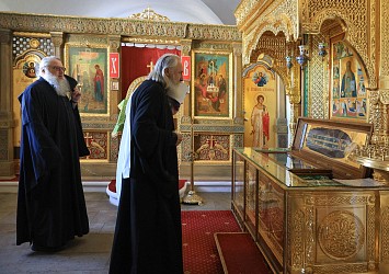 Перед началом богослужения митрополит Феогност поклонился честным мощам преподобного Аристоклия, старца Афонского и Московского.