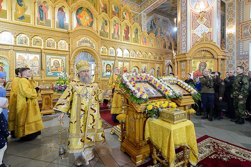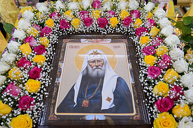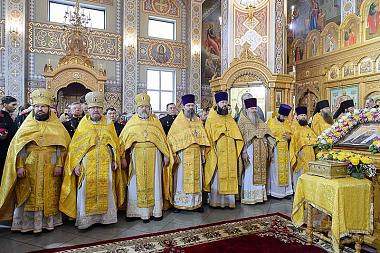 В завершение Литургии состоялось славление святителю Тихону, Патриарху Всероссийскому, перед ковчегом с частицей его честных мощей.