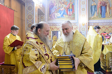 Главе Митрополичьего округа Русской Православной Церкви в Республике Казахстан сослужили: председатель Издательского Совета Русской Православной Церкви митрополит Калужский и Боровский Климент, епископ Талдыкорганский Нектарий, управляющий делами Казахстанского митрополичьего округа епископ Каскеленский Геннадий, епископ Карагандинский и Шахтинский Севастиан, епископ Усть-Каменогорский и Семипалатинский Амфилохий, благочинный приходов г. Алма-Аты протоиерей Валерий Захаров, благочинный приходов г. Астаны архимандрит Сергий (Карамышев), ведущий специалист Издательского Совета, куратор просветительского проекта «Радость Слова» иерей Андрей Степанов, руководители епархиальных отделов и комиссий в священном сане, настоятели и духовенство храмов Алма-Атинской епархии.