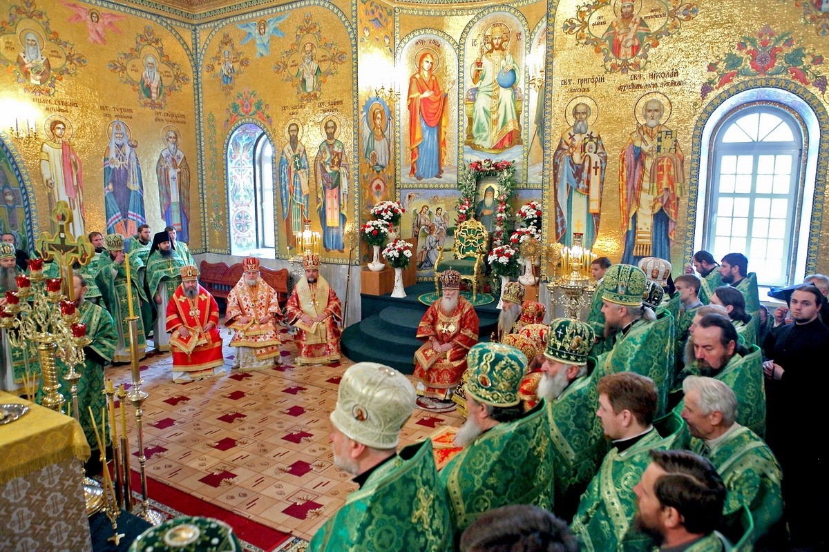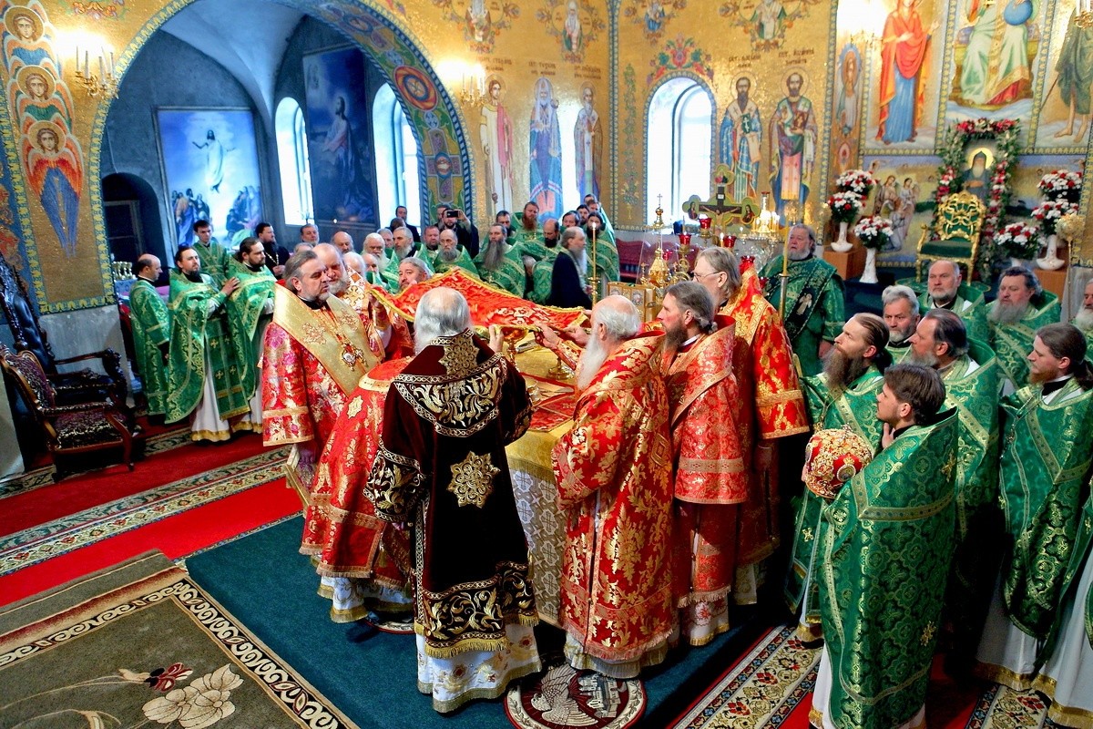 Праздничное богослужение совершалось перед ракой с цельбоносными мощами преподобного Амфилохия Почаевского, установленной в центре собора.