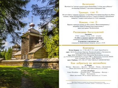 По благословению митрополита Петрозаводского и Карельского Константина опубликован информационный красочный буклет, рассказывающий о Свято-Ильинской Водлозерской мужской пустыни. Издание выпущено к 20-летию основания обители.
