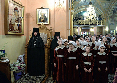 Среди молившихся в храме присутствовали: Председатель Синодального информационного отдела В.Р. Легойда; настоятельница Покровского ставропигиального женского монастыря игумения Феофания (Мискина); настоятельница Зачатьевского ставропигиального женского монастыря, Заместитель Председателя Синодального отдела по монастырям и монашеству игумения Иулиания (Каледа); настоятельница московского подворья Свято-Успенского Пюхтицкого ставропигиального женского монастыря игумения Филарета (Смирнова); насельницы Покровской обители и воспитанницы монастырского приюта для девочек.